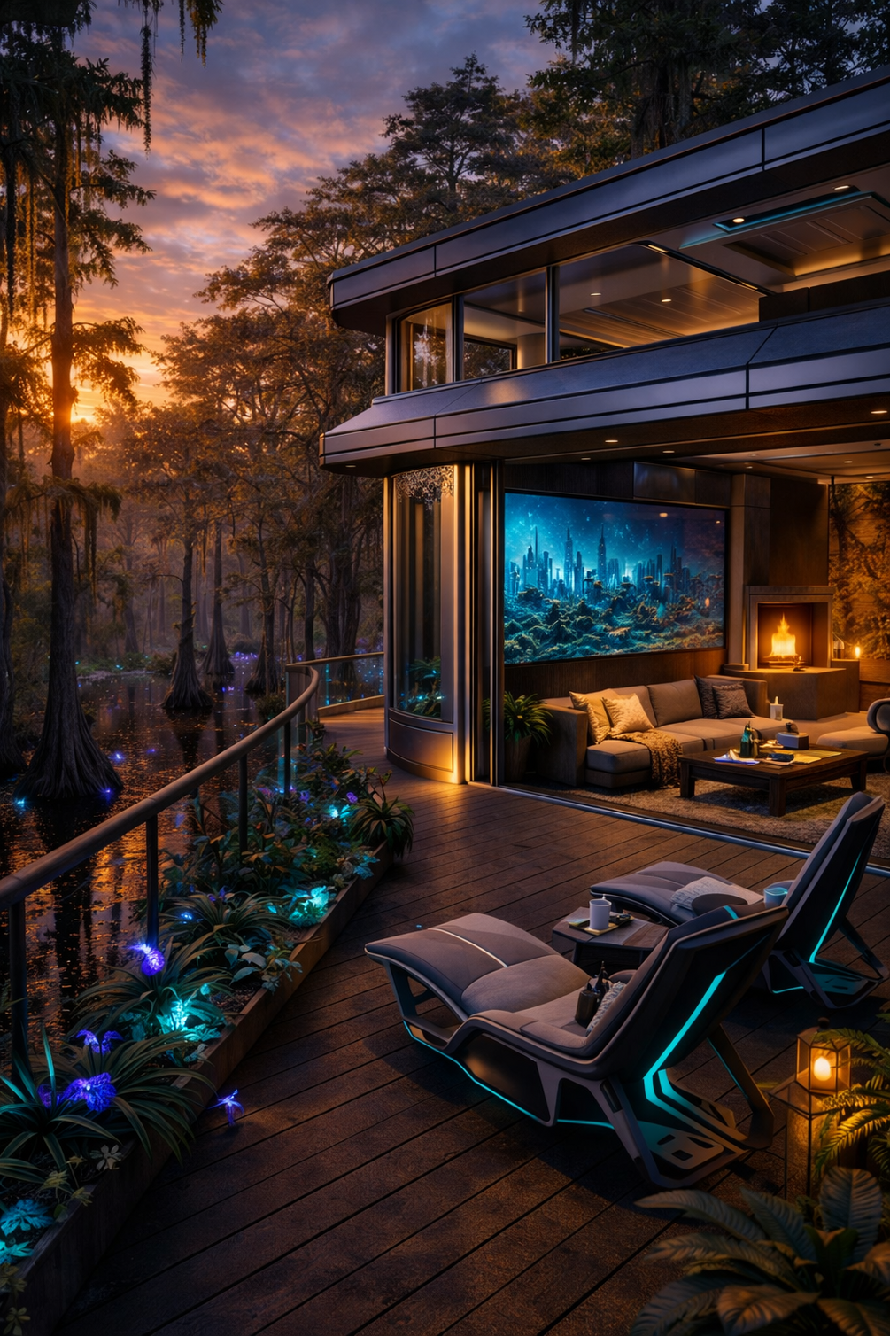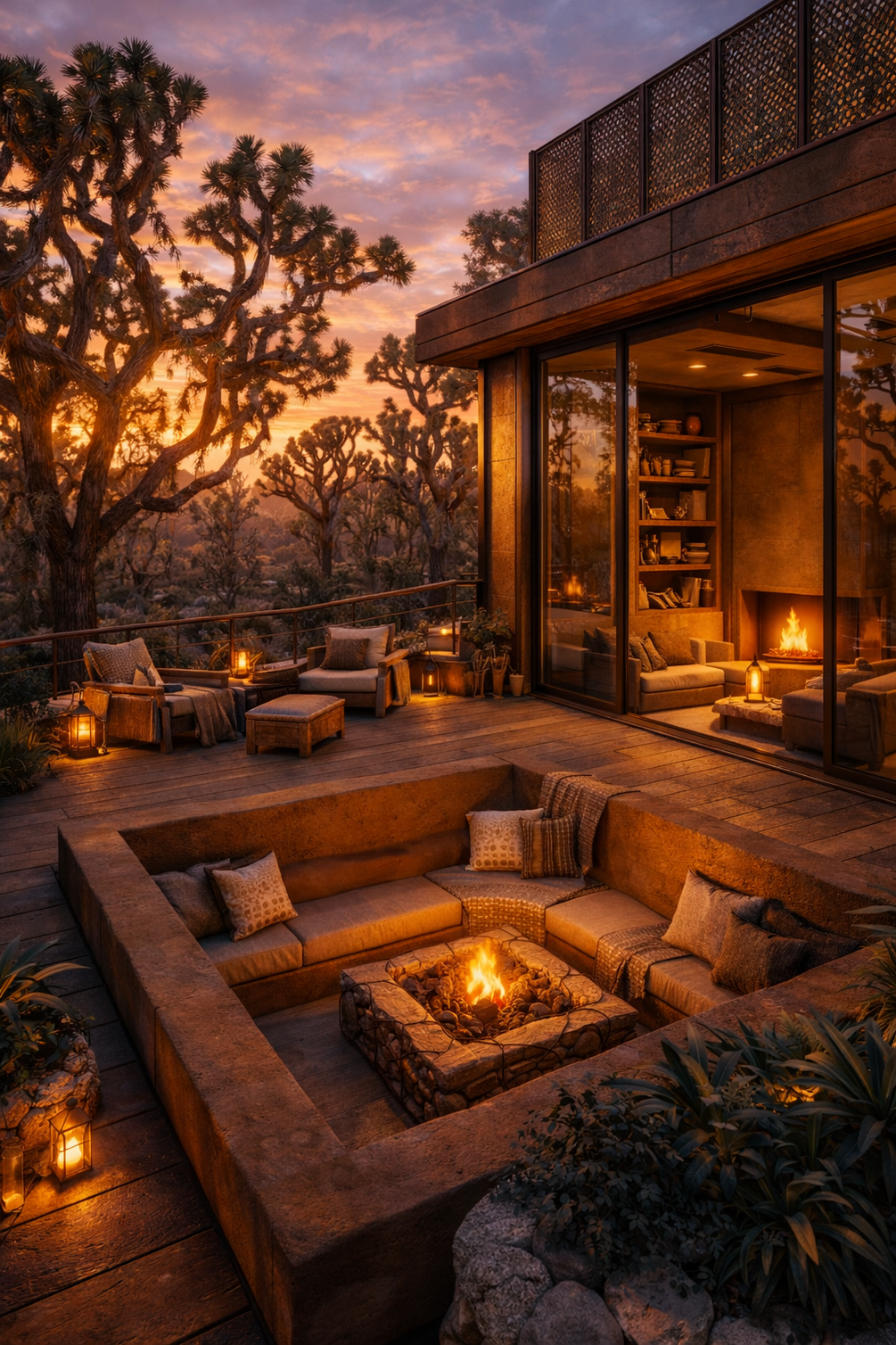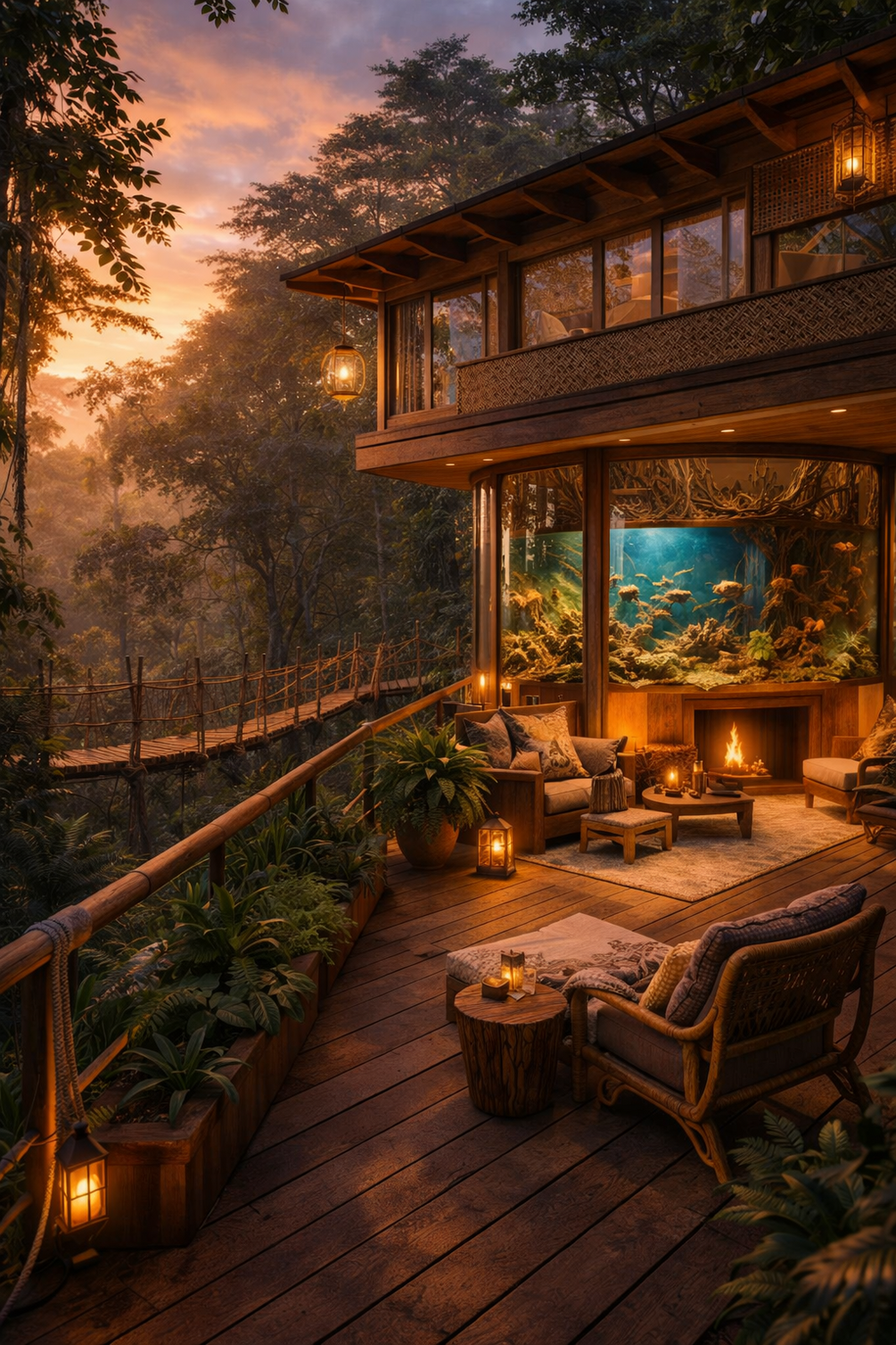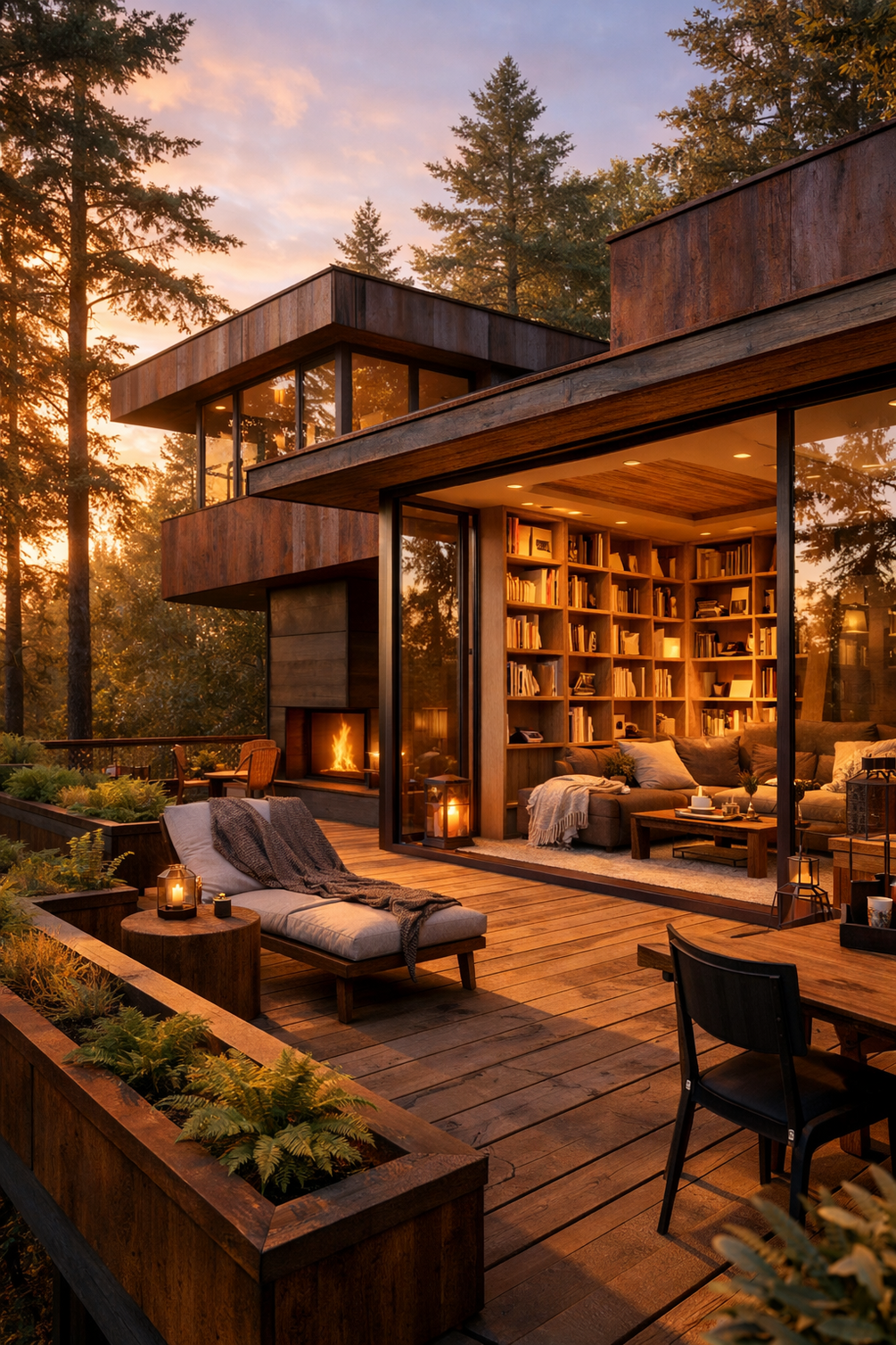 Creates a sense of coziness and integration with a dense forest site. Focuses on texture, warmth, and livability.