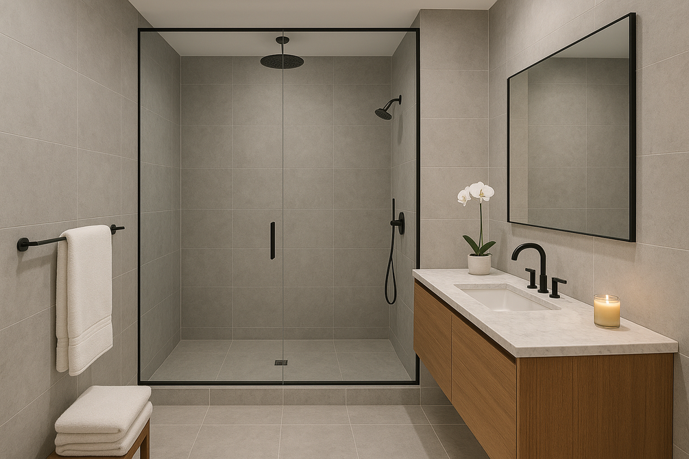 Visualize a luxurious bathroom oasis. Customize the tub, vanity, fixtures, and tile. Perfect for marketing a primary bath as a high-end spa experience.