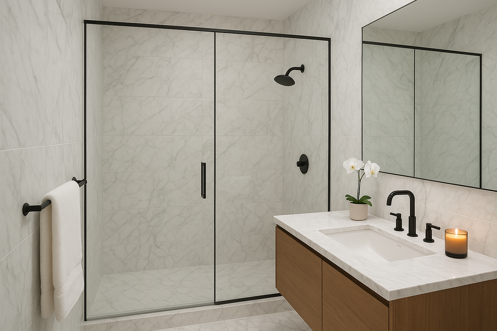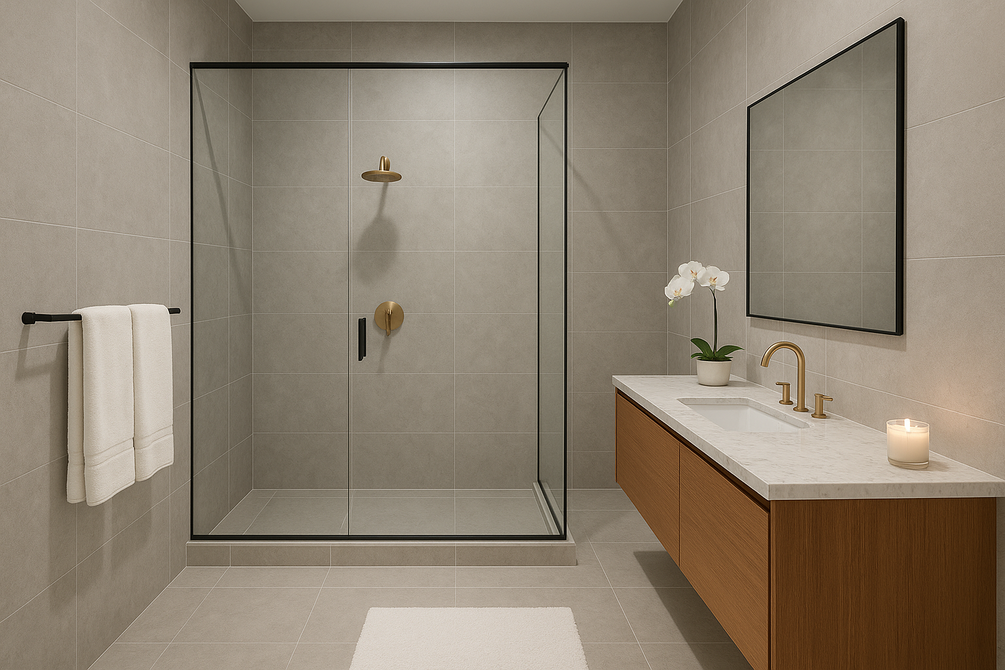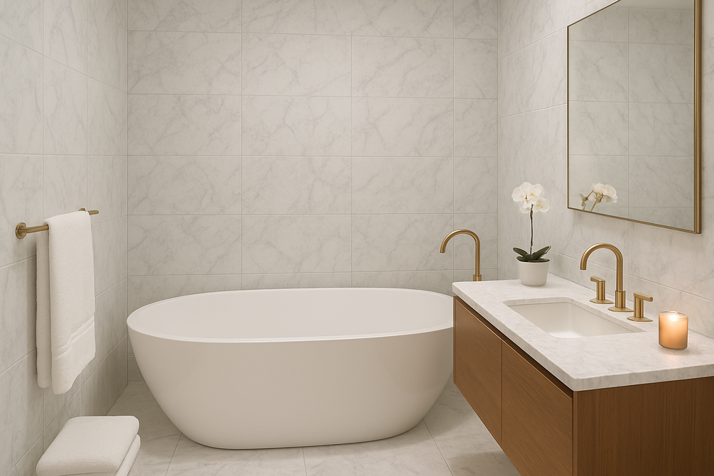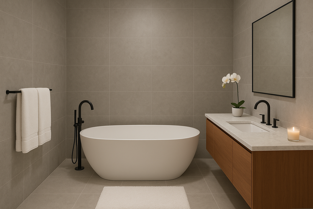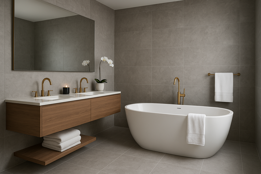 Visualize a luxurious bathroom oasis. Customize the tub, vanity, fixtures, and tile. Perfect for marketing a primary bath as a high-end spa experience.